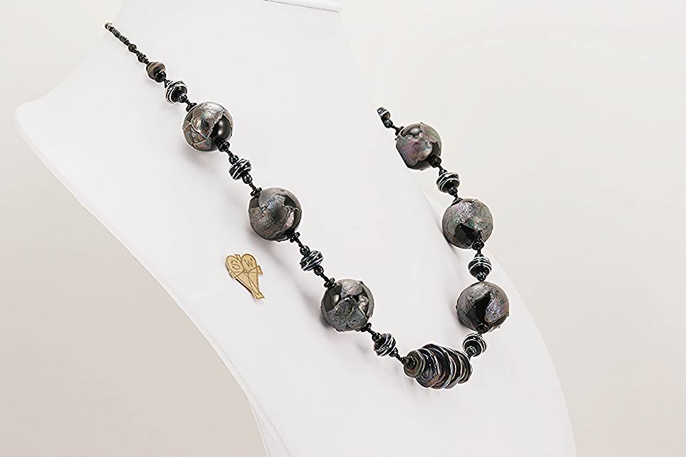 One-of-a-kind necklace of quality craftsmanship, made of (19) individually handmade black colored blown glass beads with a grey metallic “raku” effect & sterling silver artistic accents.  The center focal bead is a unique spiral/screw with silver edging.  Flanked by small black beads with sterling silver hand applied spiraling, and larger graduated black hollow beads with silver flake overlaid (these are difficult to make) creating a metallic “raku” effect that reflects many colors, giving a tarnished silver look that’s cool and edgy.  This fantastic necklace is truly unique (& lightweight for it’s look) making it a really fun piece to wear casual or dressy.
