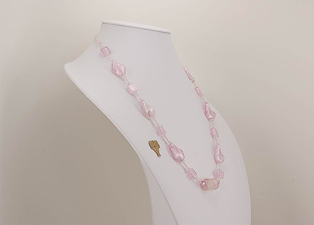 Necklace handmade with pink colored glass beads and sterling silver lining.