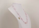 One-of-a-kind necklace of quality craftsmanship, made of (19) individually handmade pink colored blown glass beads with sterling silver lining, surrounded by semi precious clear quartz.  The center focal bead is made with pink glass covered with mineral rich rose quartz & clear quartz, then streaked with silver, making this a very deep translucent pinkish clear bead with a soft shimmer.  Flanking it are (16) vintage Venetian blown beads that also shimmer from the silver lining, plus semi precious clear quartz mini disc beads catch that refract light, giving this necklace radiant elegance.