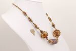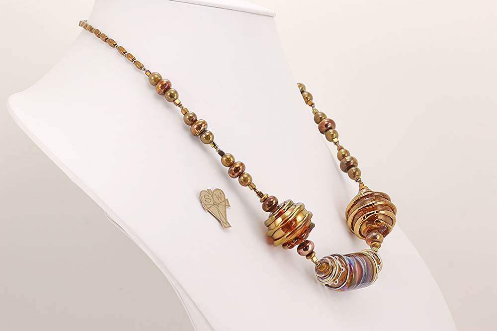 One-of-a-kind necklace of quality craftsmanship, made of (37) individually handmade copper colored blown glass beads with bronze, rose gold & silver accents.  The center focal bead is made of many minerals & silver to achieve this artful piece, with every view full of depth & interest.  The large (1) inch hollow spheres (very difficult to make) are of bright copper/bronze and have a modern elegance.  This beautiful necklace is truly unique and comfortable to wear.  And if you are a ginger/red head, this piece is an fabulous addition to your wardrobe indeed!