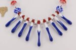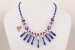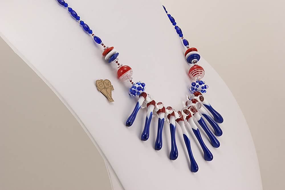 | approx. 26" LONG | Completely hand knotted with heavy gauge S-lon string for long lasting joyful wear. All the beads are custom "seated" to eliminate any loose/rattling beads. This is very tedious, but it gives the necklace it's wonderful body and "hang". Then finely finished with a sterling silver logo tag. Center pendant sticks each approx. 2/1/2" x 1/2". |